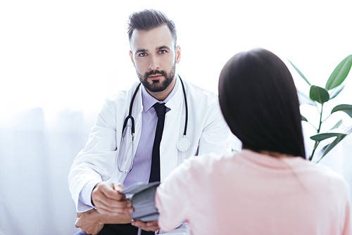 doctor making breast examination for smiling patient using ultrasound scanner in clinic